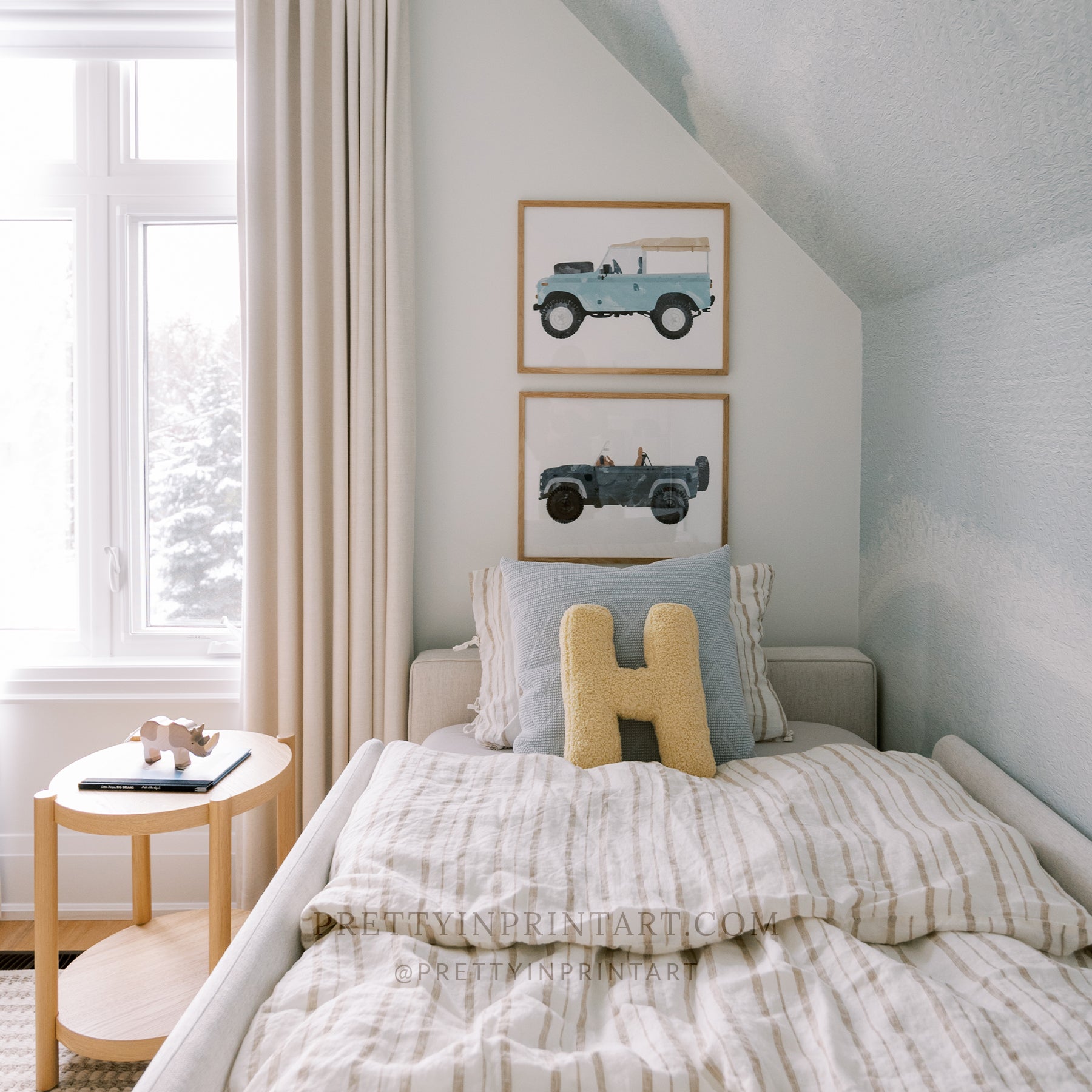 Bring a sense of adventure and timeless charm to your child’s room with PrettyinPrintArt.com’s Land Rover and vintage transportation art prints. Perfect for boys’ bedroom décor, these illustrations feature classic Land Rovers, vintage cars, and charming modes of travel, all lovingly reproduced in a nostalgic, storybook style. Ideal for creating a gallery wall or as a standout piece above a bed or reading nook, our transportation-themed art adds personality and imagination to any space. Printed on archival-quality fine art paper and available framed or unframed, these prints are a unique way to inspire little explorers and create a room filled with classic character.