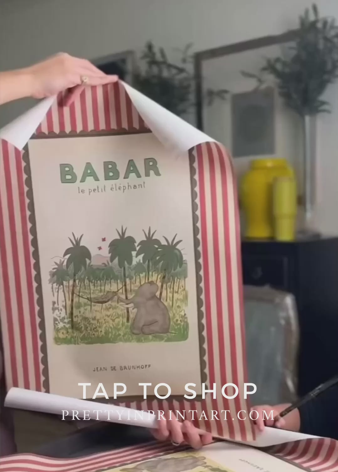 Our Babar the Elephant inspired artwork is created from the original books, illustrated by the late Jean de Brunhoff. These exclusive pieces of art are printed with a real-look fabric border - you will see fabric fibres and real linen textures (the fabric border is PRINTED, it is not real fabric - that would make it very expensive!). The perfect art for any vintage nursery or eclectic kids bedroom decor.